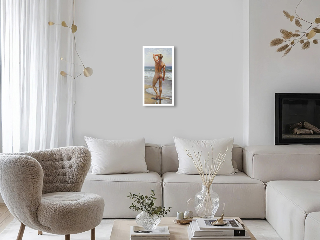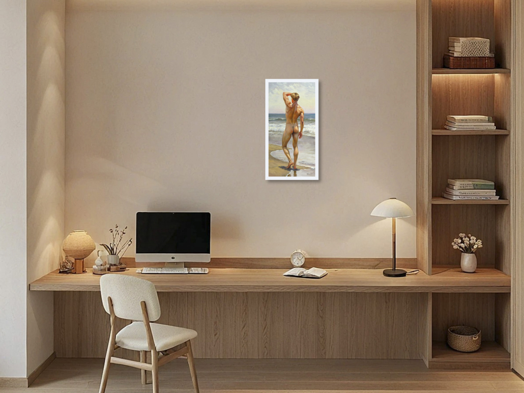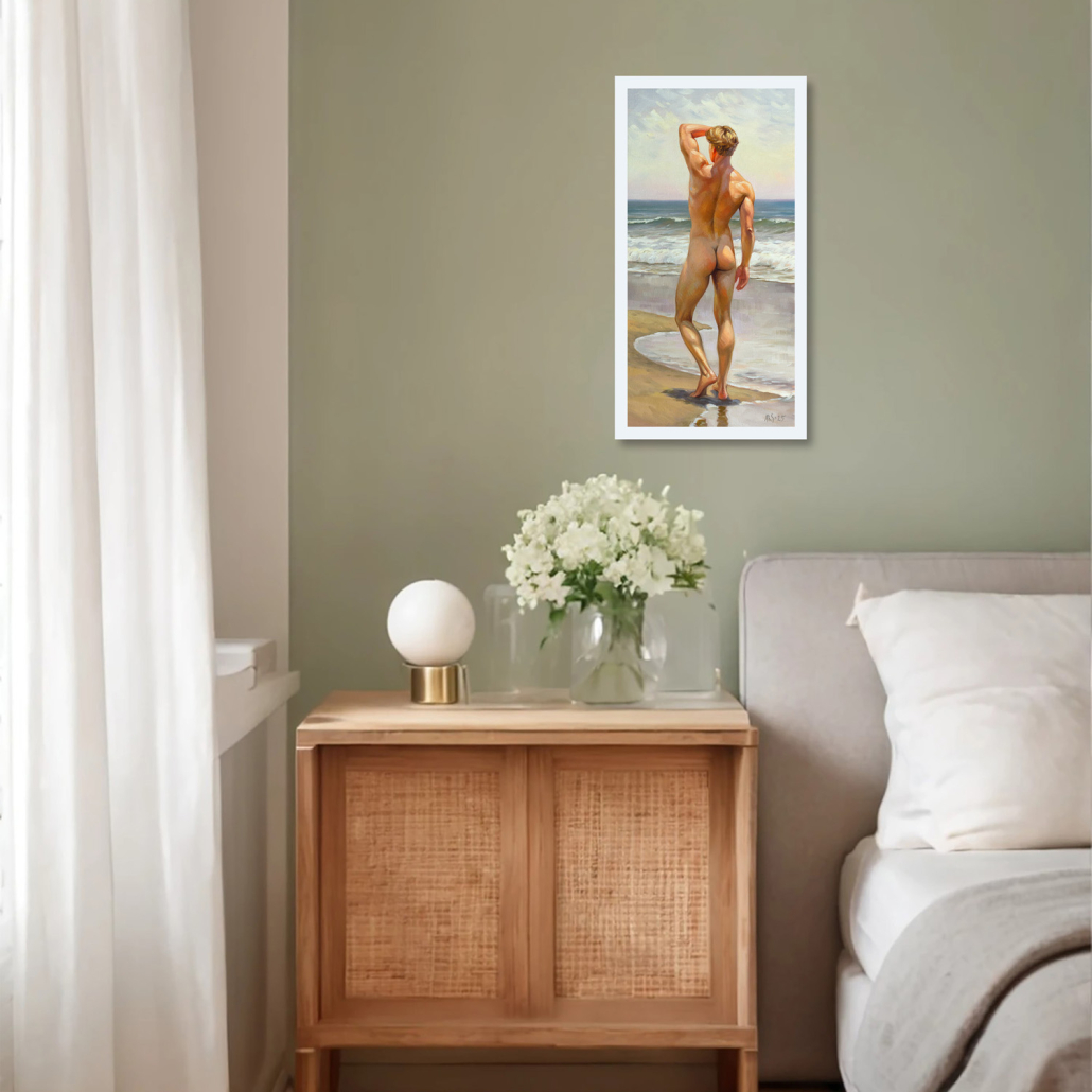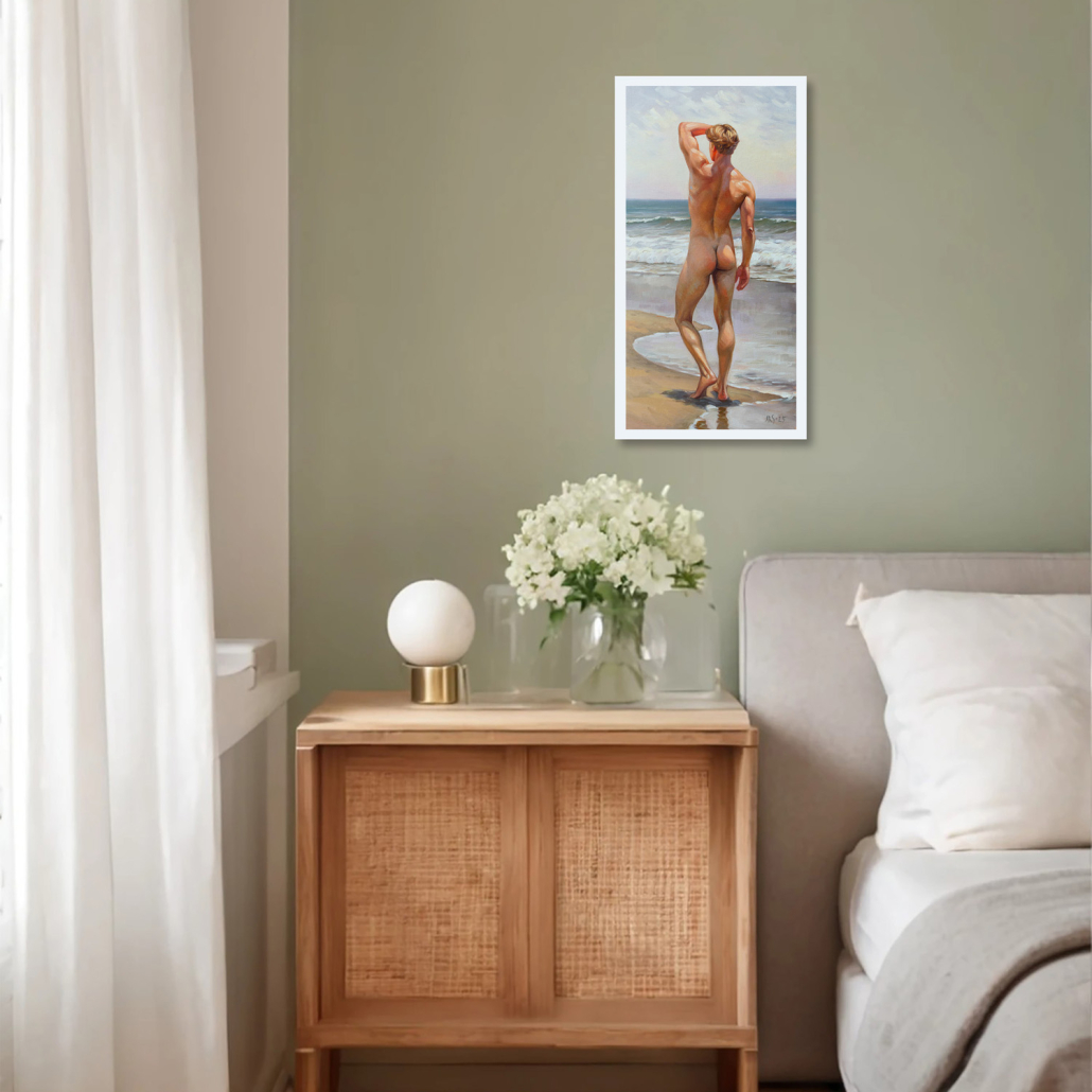 A muscular male figure stands on the shore, gazing out toward the ocean with an air of contemplation, the sunlight accentuating the contours of his back and arms. The gentle waves lap at his feet, and the sandy beach stretches out behind him, merging into a soft, hazy horizon where the sea and sky meet in muted blues and warm pastels. His posture, with one arm raised behind his head and the other relaxed at his side, conveys both strength and serenity. The painting captures a tranquil moment, infused with a sense of freedom and introspection, complemented by the play of light, creating a soft, inviting atmosphere. The overall aesthetic resonates with a timeless appreciation for the human form in a natural setting.