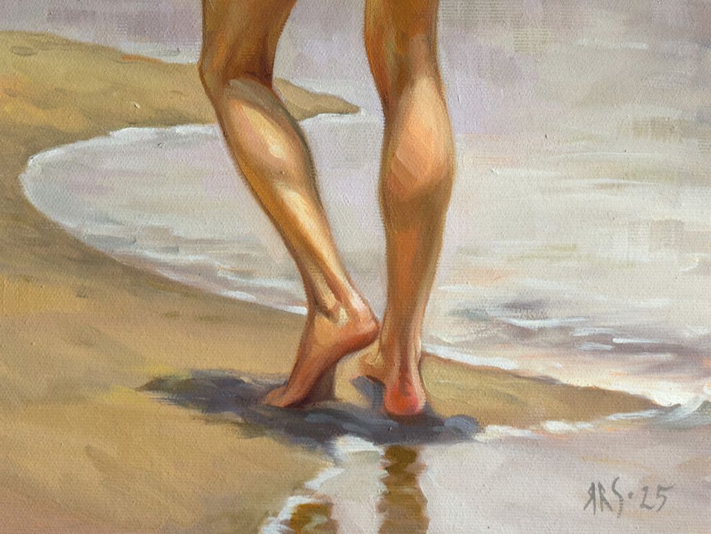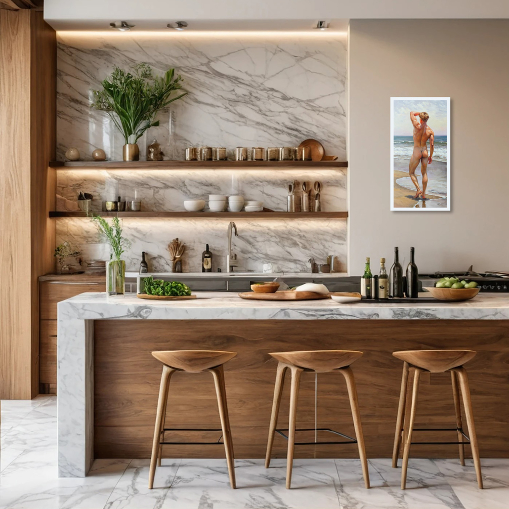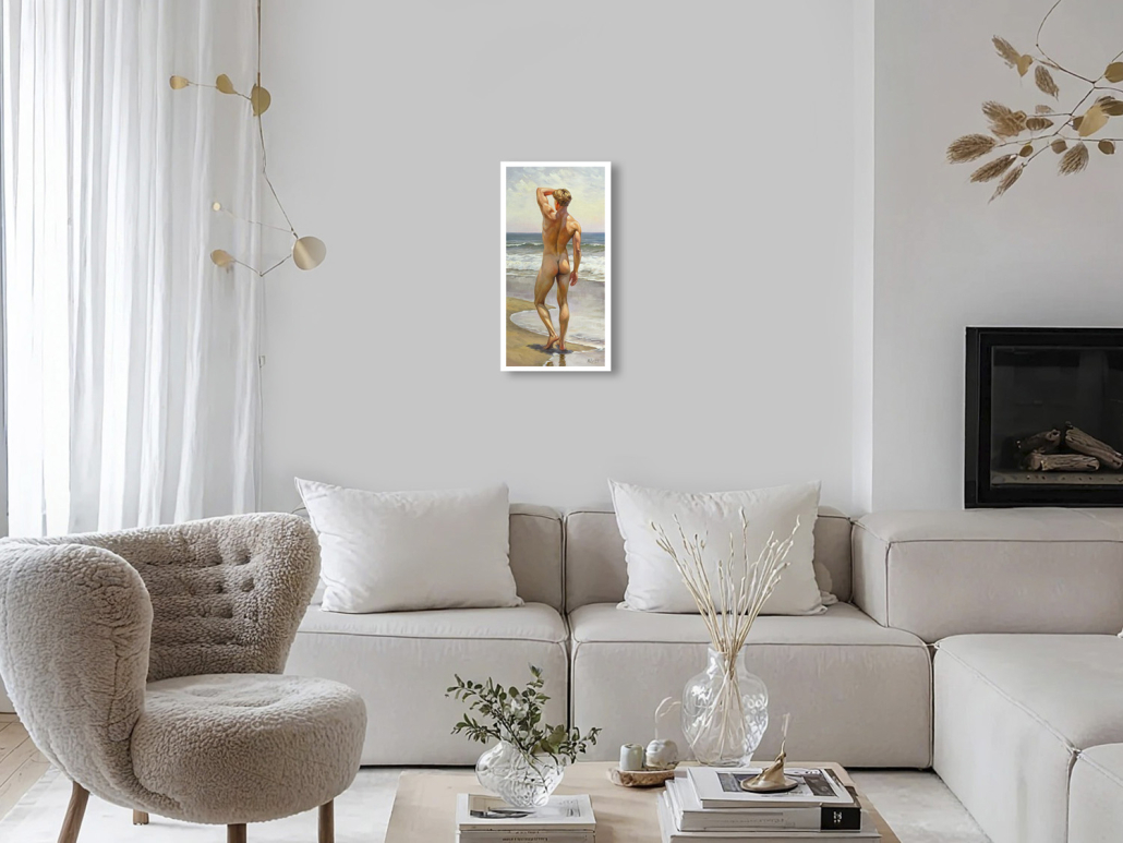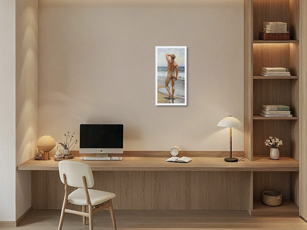 A muscular male figure stands on the shore, gazing out toward the ocean with an air of contemplation, the sunlight accentuating the contours of his back and arms. The gentle waves lap at his feet, and the sandy beach stretches out behind him, merging into a soft, hazy horizon where the sea and sky meet in muted blues and warm pastels. His posture, with one arm raised behind his head and the other relaxed at his side, conveys both strength and serenity. The painting captures a tranquil moment, infused with a sense of freedom and introspection, complemented by the play of light, creating a soft, inviting atmosphere. The overall aesthetic resonates with a timeless appreciation for the human form in a natural setting.