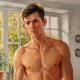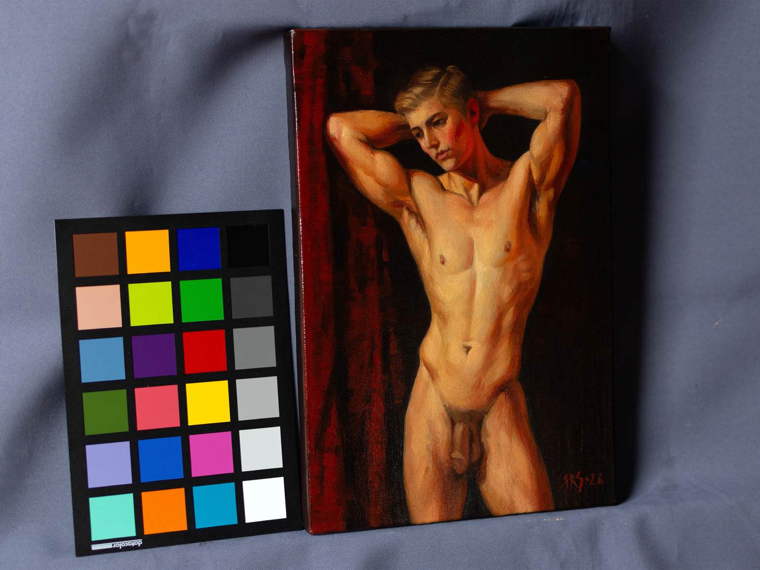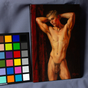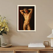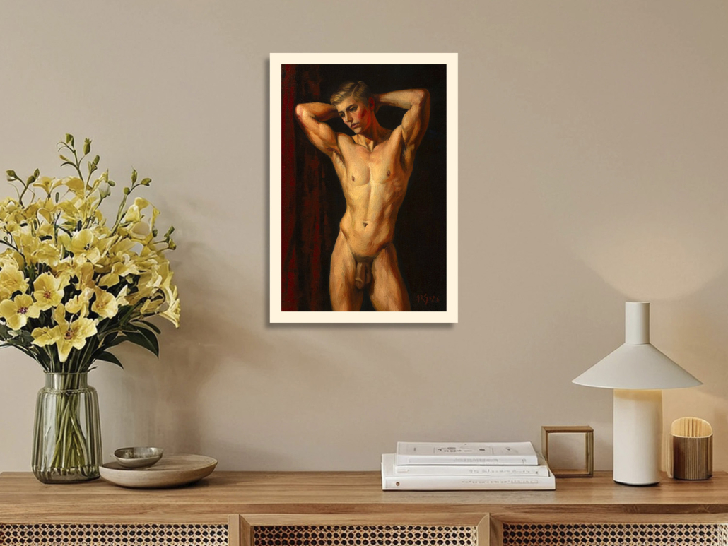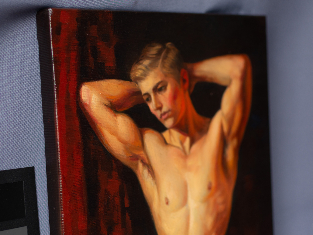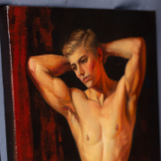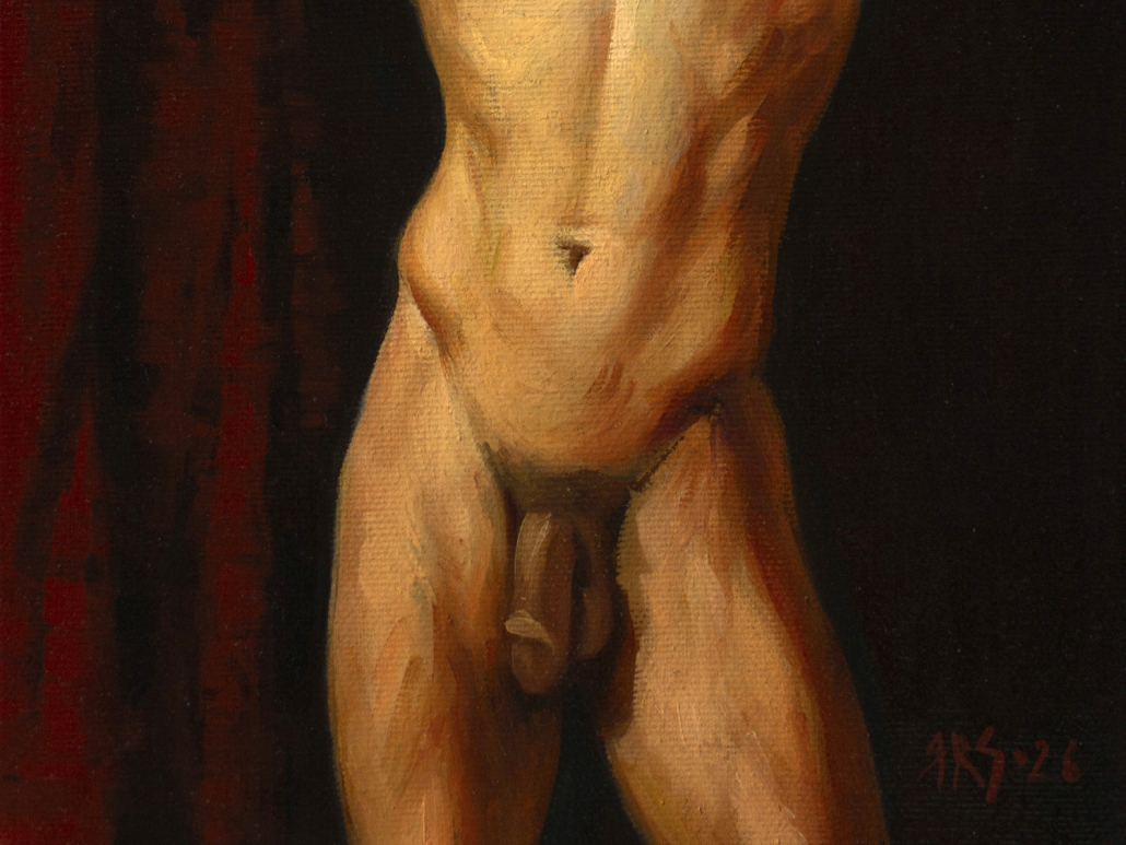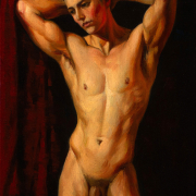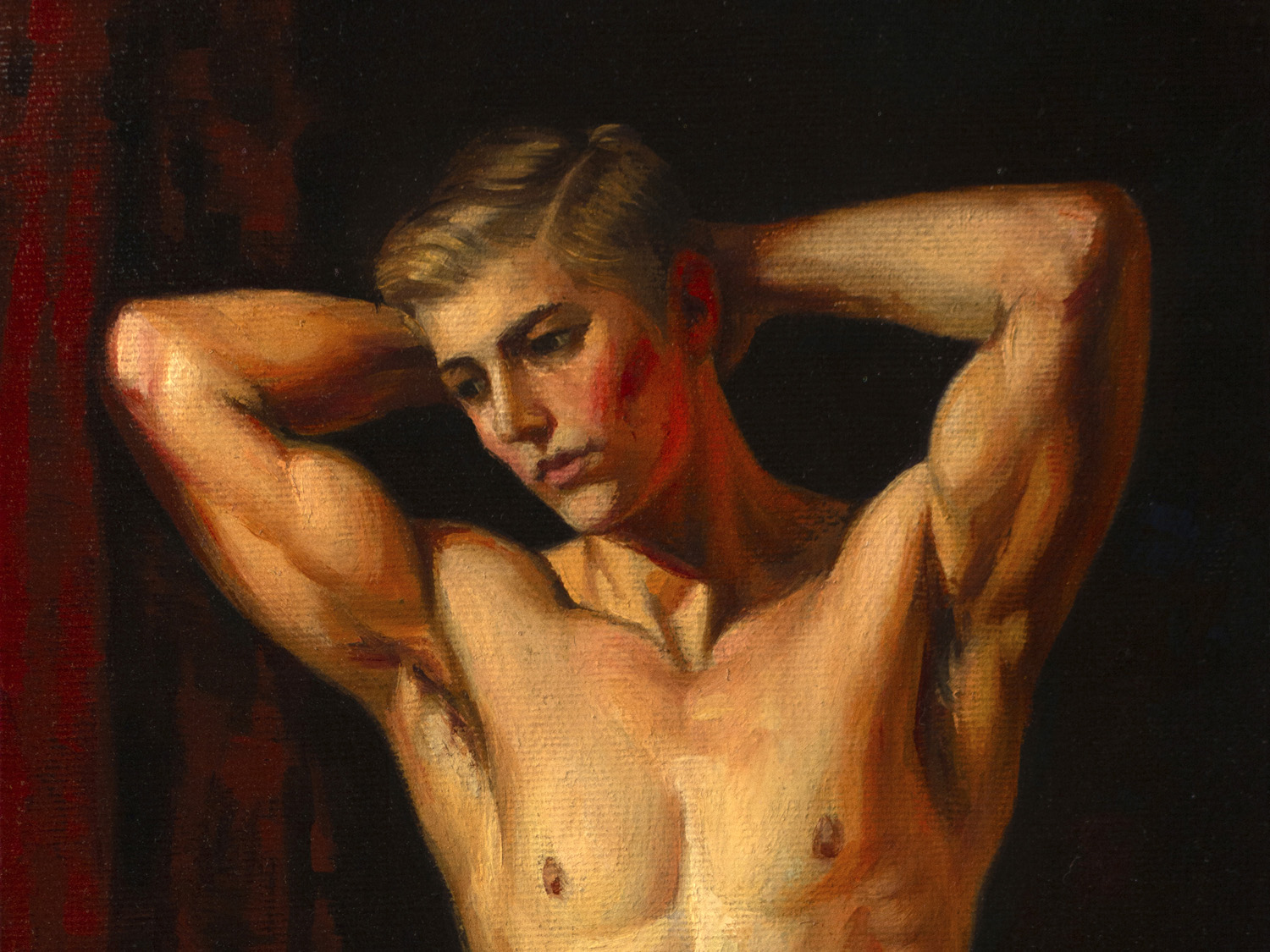 A handsome young man stands before the viewer. He has raised his arms and placed his palms behind his head, highlighting his muscular build and smooth skin. His head is slightly turned, and his pensive expression draws the viewer’s gaze. In the background, deep, rich red draperies contrast sharply with the more subtle tones of his skin, accentuating his body. The painting’s style is realistic, with strong brushstrokes that reveal details of light and shadow, creating a sense of mystery, depth, and volume. In this work, the artist speaks of the beauty of the human body as a great and beautiful mystery that can capture our imagination every day, year after year, millennia after millennia.