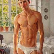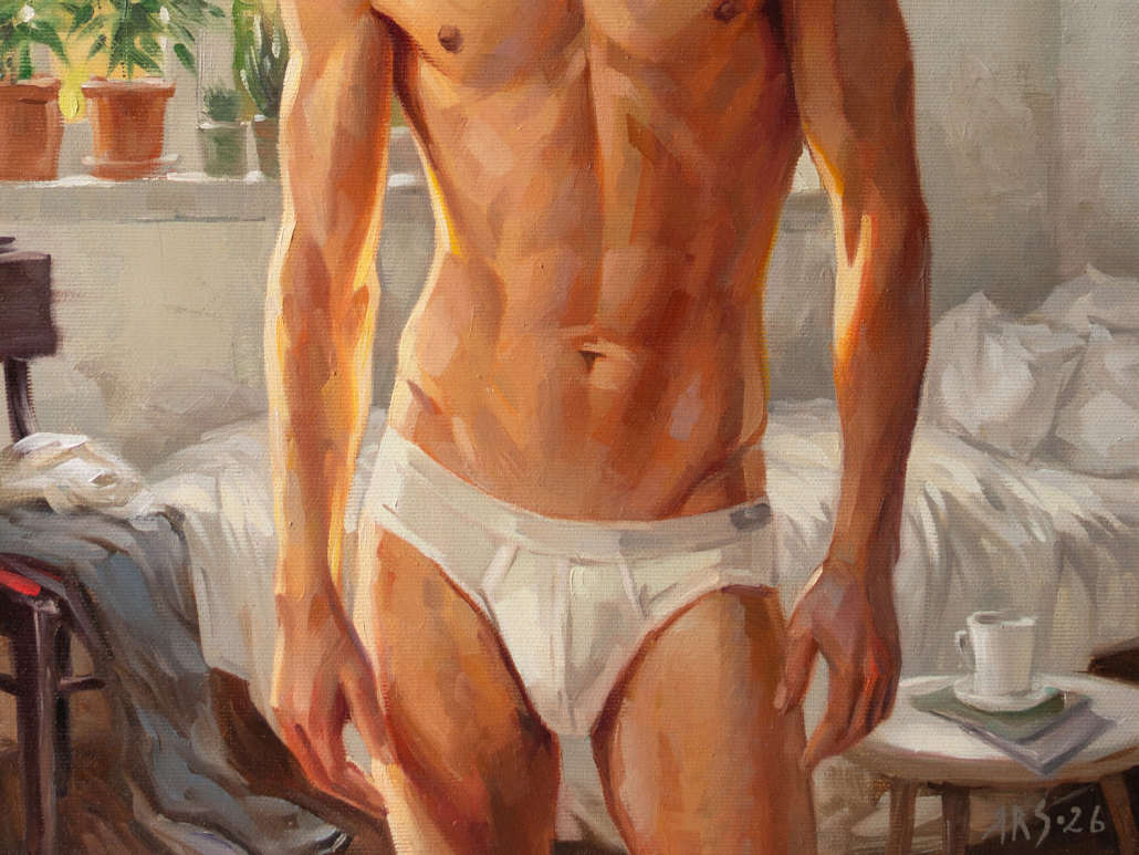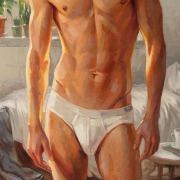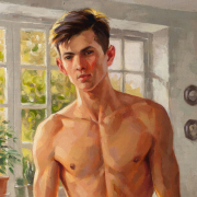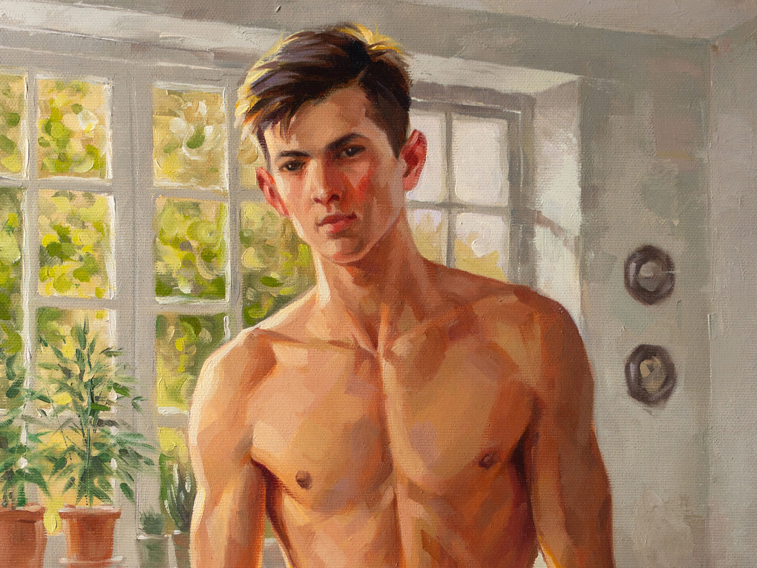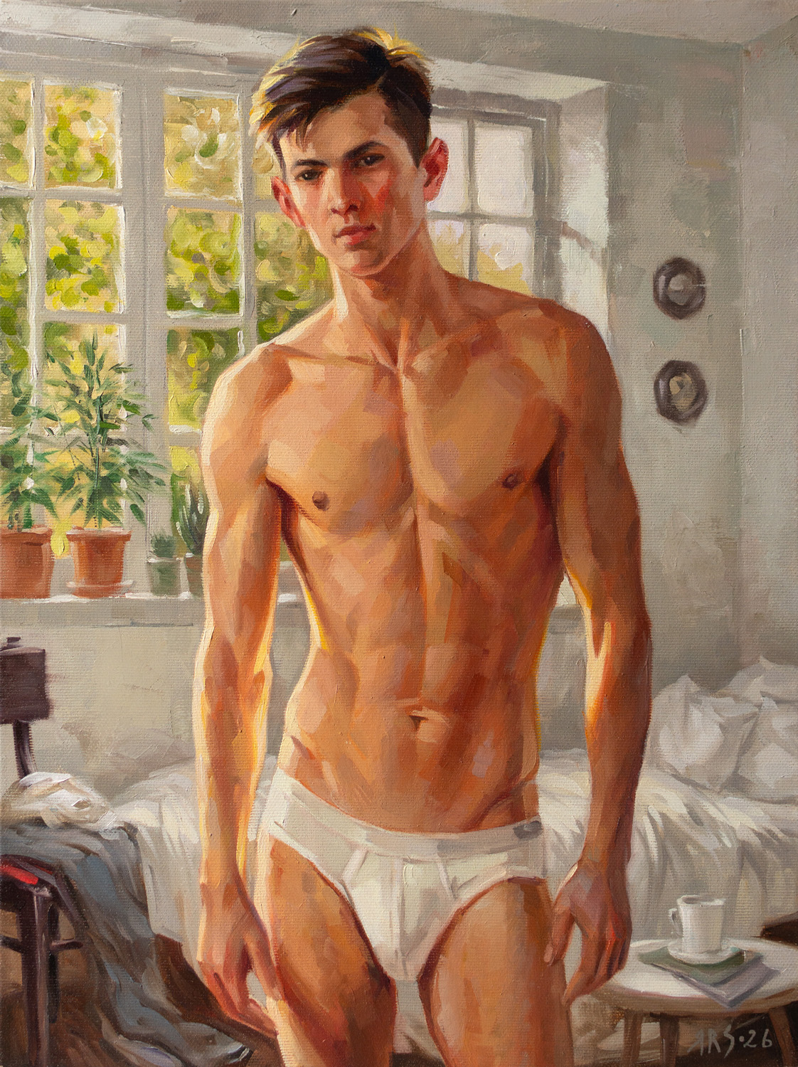 In the warm light of the morning sun, a young man stands in a softly lit room. He has a well-developed, athletic build with defined pectorals, defined abs, and strong arms and legs. He looks directly at the viewer with a calm expression, surrounded by lush potted plants framing large windows that let in bright sunlight, creating a serene and inviting atmosphere. The room has a casual elegance: in the background, a rumpled bed, scattered clothes, and a bedside table with a mug and magazines suggest a relaxed morning. The artist uses a warm palette and smooth brushstrokes to capture the tranquility of a summer morning and his handsome, slender, youthful figure, evoking a sense of intimacy and tranquility.