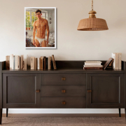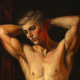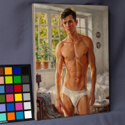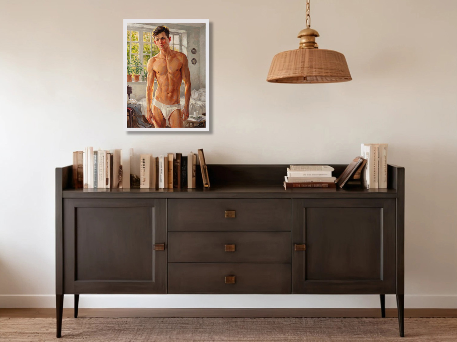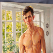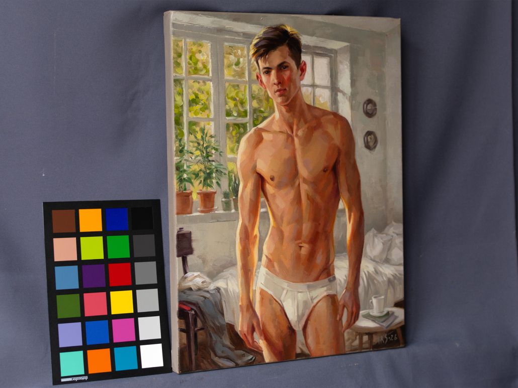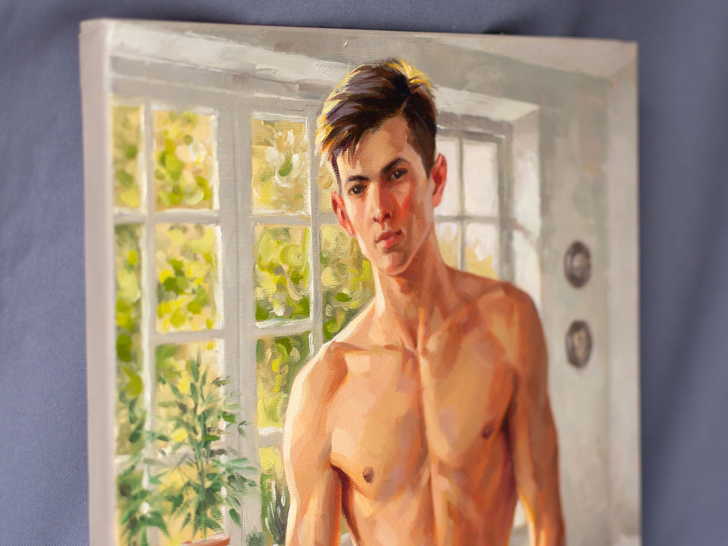 In the warm light of the morning sun, a young man stands in a softly lit room. He has a well-developed, athletic build with defined pectorals, defined abs, and strong arms and legs. He looks directly at the viewer with a calm expression, surrounded by lush potted plants framing large windows that let in bright sunlight, creating a serene and inviting atmosphere. The room has a casual elegance: in the background, a rumpled bed, scattered clothes, and a bedside table with a mug and magazines suggest a relaxed morning. The artist uses a warm palette and smooth brushstrokes to capture the tranquility of a summer morning and his handsome, slender, youthful figure, evoking a sense of intimacy and tranquility.